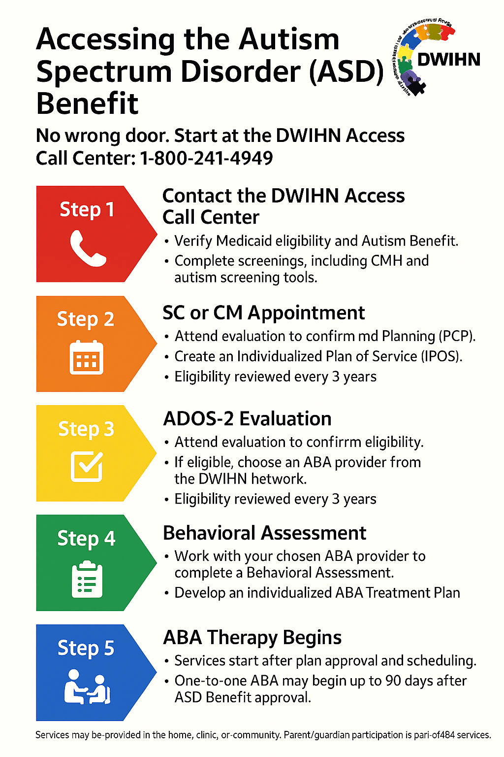 At DWIHN, there is “no wrong door” to begin the process of accessing services for an Autism evaluation. A referral can be made through the DWIHN Access Call Center in multiple ways.